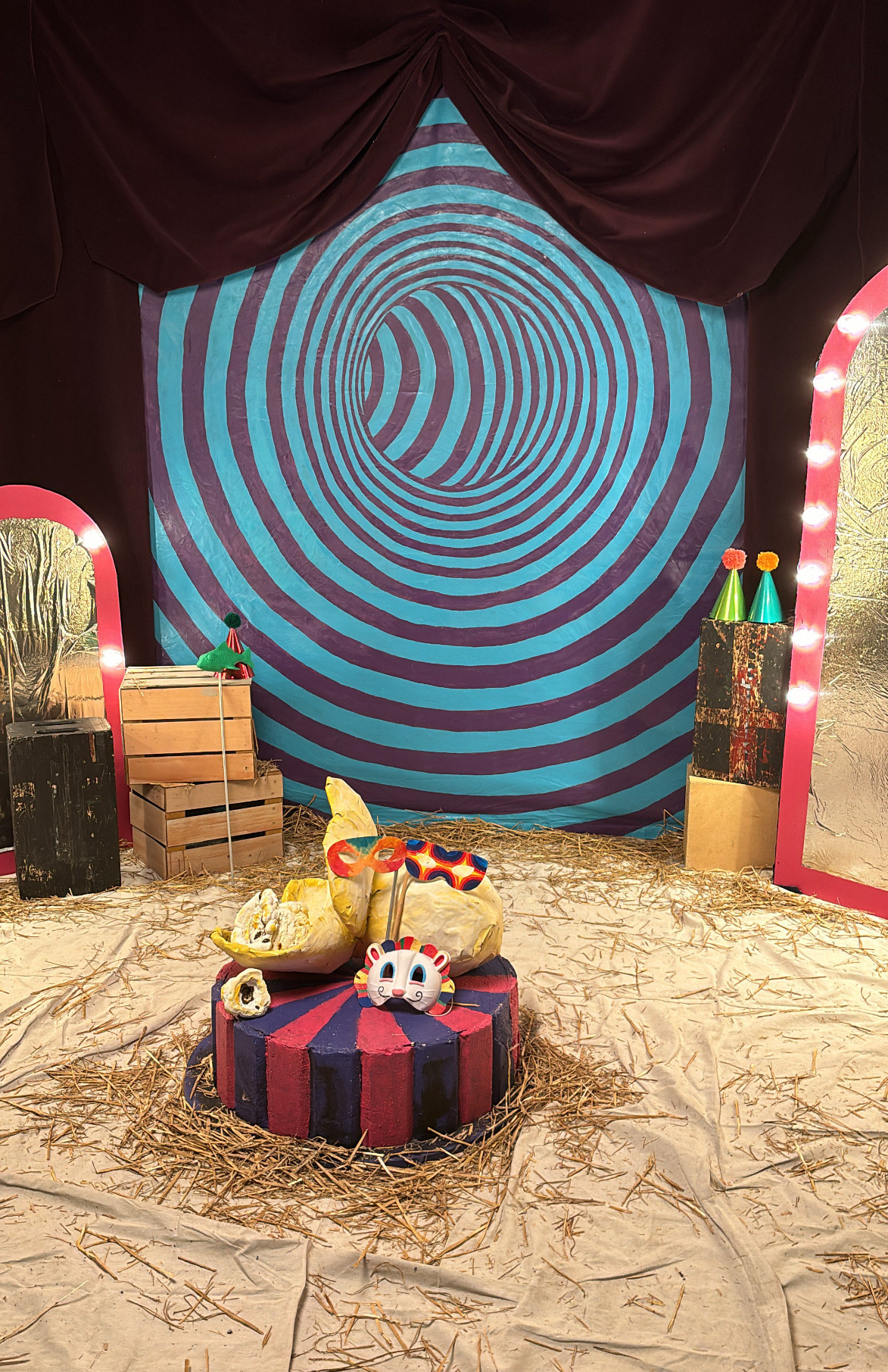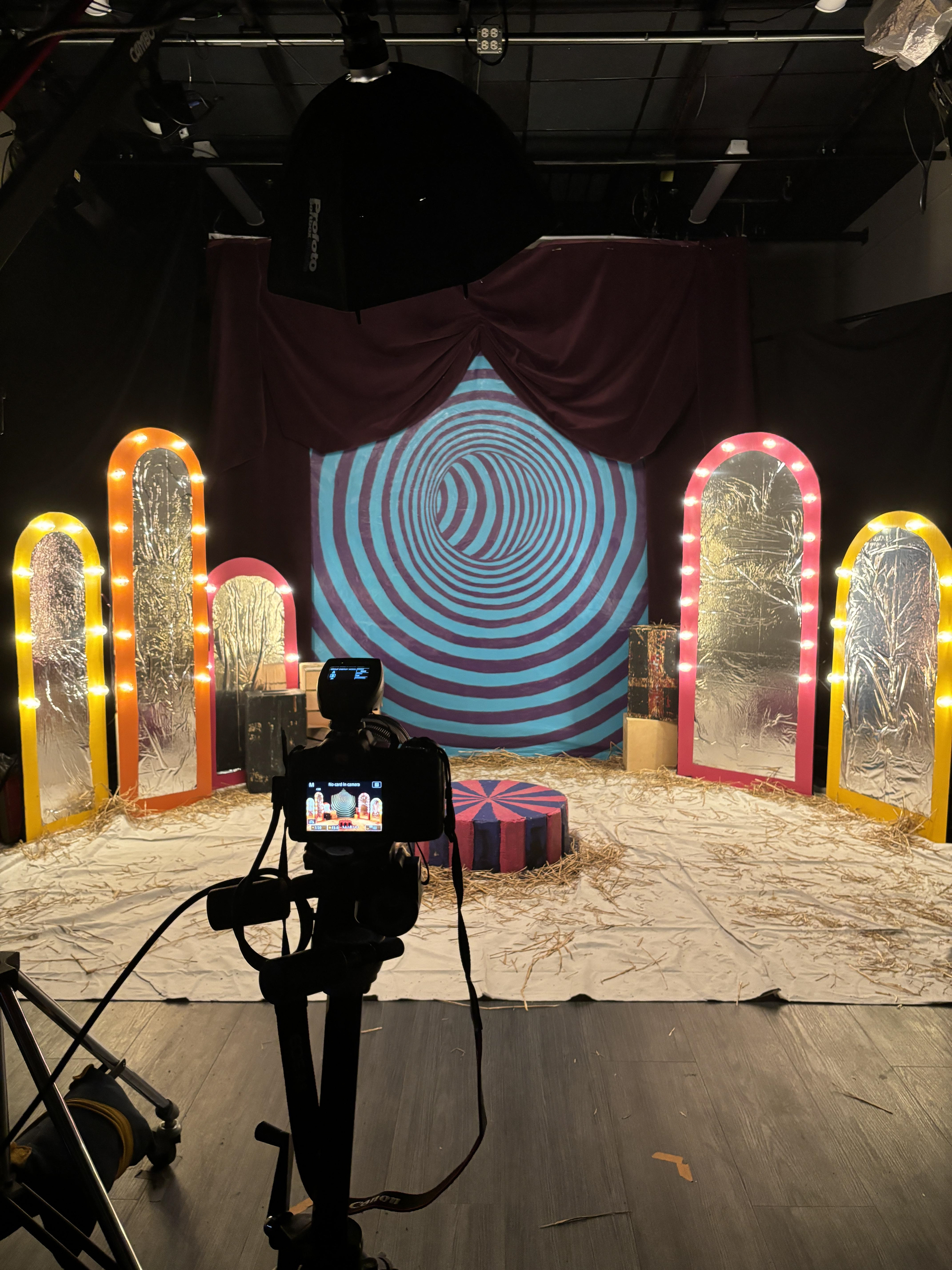 For the Media Department mixer, my team was in charge of designing and building the "photo booth" set. We shaped the wooded mirror frames, cut holes in them for the lights, painted the optical illusion backdrop, and hand-crafted the props. (All props except the 3D printed fish.)